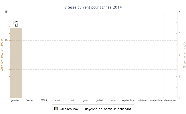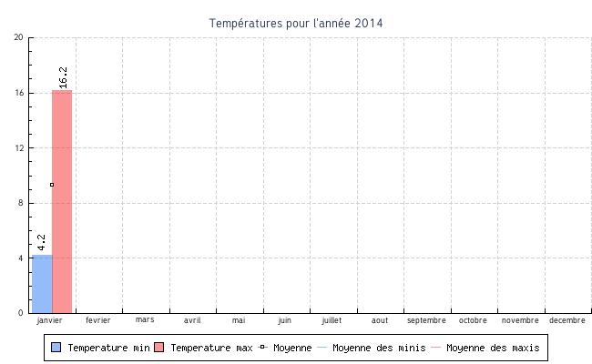 | janvier | 4.2 °C | 7.5 °C | 16.2 °C | 13.2 °C | 9.3 °C | 3.7 km/h | 12.2 km/h | ONO |